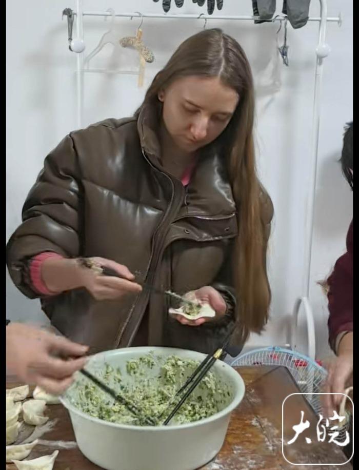 “中国饺子有着独特的记号道理,代表着团圆和富足。”万莱莉说。她学着大姨的时势,将馅料放在面皮中央,防范翼翼地握合。