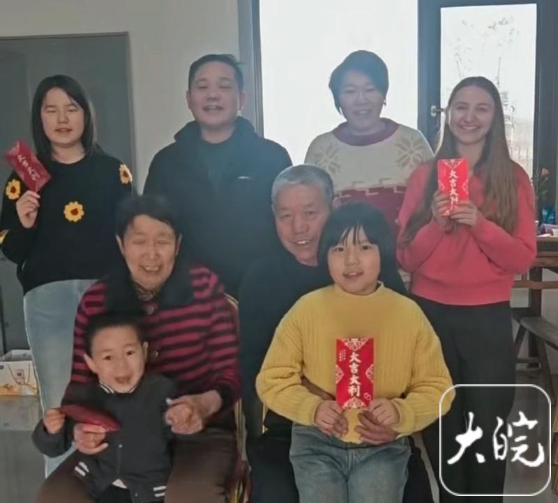 万莱莉(后排右一)收到了新年红包,与李浩一家东说念主合影贪恋。