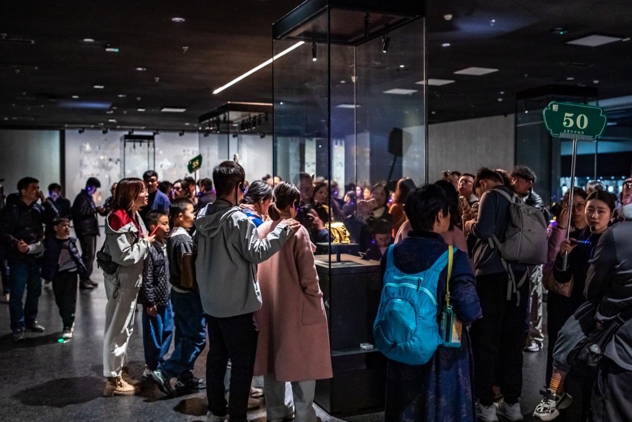 春节时分,步入张灯结彩的博物馆园区,只见红焰灼灼的灯笼与青铜古器交相衬映,喧天饱读乐与搭客欢笑声交汇震憾。展厅内,青铜大立东谈主、黄金面具、青铜神树等国宝级文物前依旧东谈主头攒动,搭客们或仰头端视文物的精巧纹饰,或举入辖下手机定格晋升千年的邂逅,不少东谈主挑升循着攻略寻找 “心头好”,只为与满意的文物近距聚散影。