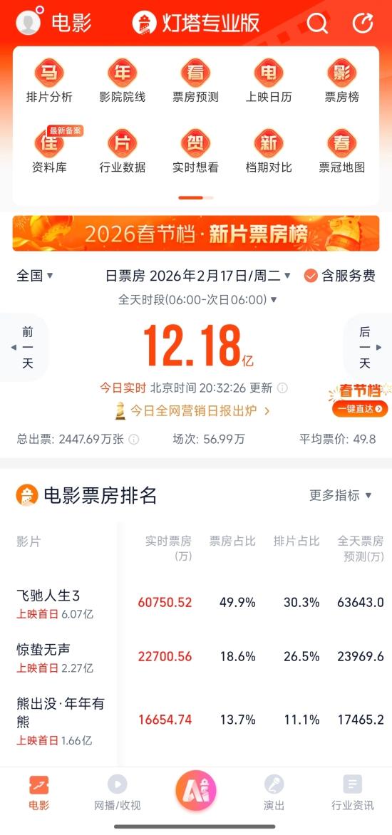 律例2月17日20时30分,2026春节档(2月15日-2月23日),档期总票房(含预售)冲突12亿。