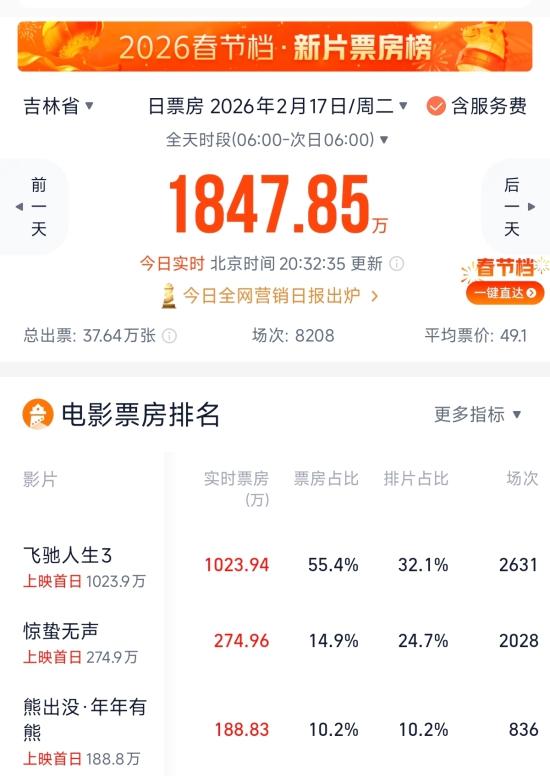 吉林省贺岁档总票房冲突1800万,依旧是《奔突东说念主生3》票房断层领跑。