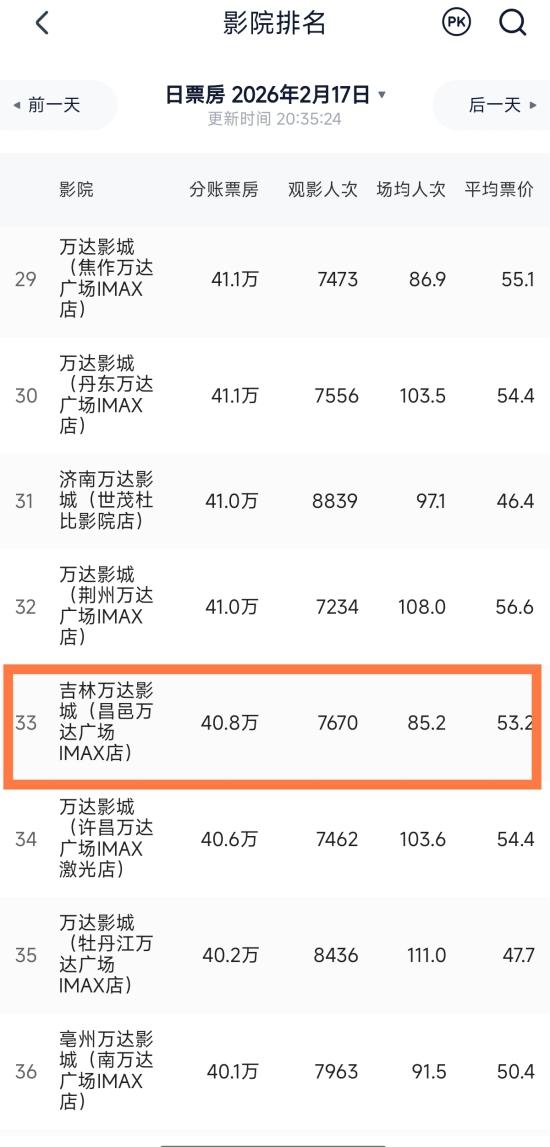 各电影院东说念主潮澎湃,其中吉林市万达影城(昌邑万达广场IMAX店)为全省票房最高的电影院,名次宇宙33名,寰映影城(摩天活力城MAX店)则是长春市票房最高的影城。